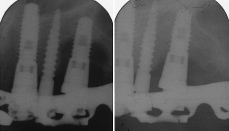 Similar to natural teeth, the gums around implants can also be subjected to bacterial colonisation leading to inflammation of gums (periimplant mucositis) and loss of bone support around the implants (Periimplantitis). Depending on the severity of the condition, the treatment may involve nonsurgical debridement (scaling under local anesthetic), surgical therapy including open flap debridement and bone regeneration. In advanced cases of peri- implantitis removal of the implant may also be considered.