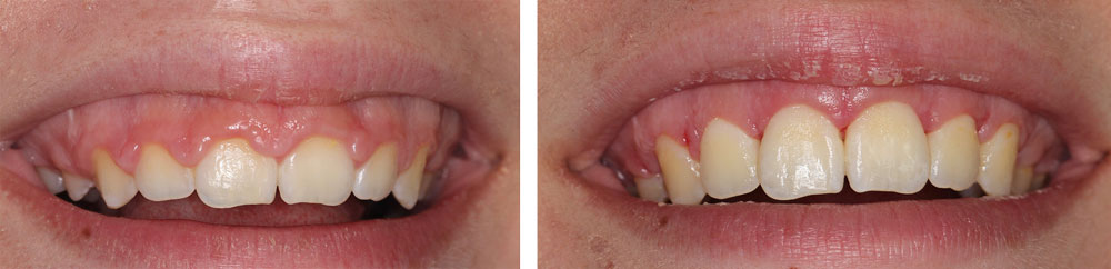 Crown lengthening increases the height of the crown by shifting the margin of the gum towards the root of the tooth. Obvious indications are in patients with excess gum display (Gummy Smile) where excess tissue gets reshaped but maintaining the normal physiological anatomy of the tooth. Other instances where crown lengthening is indicated are circumstances where cavities, fractures or restorations extend below the gum line.